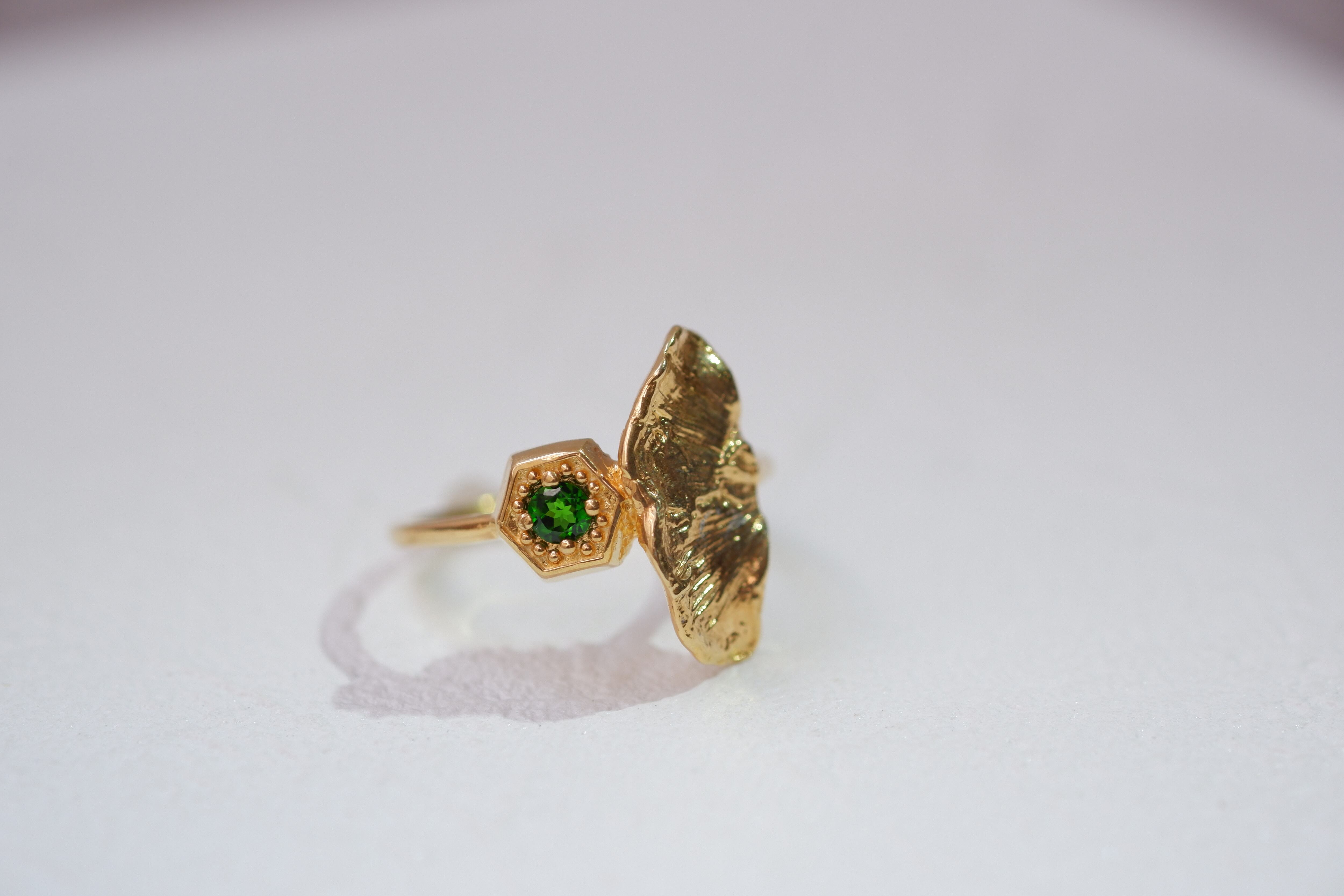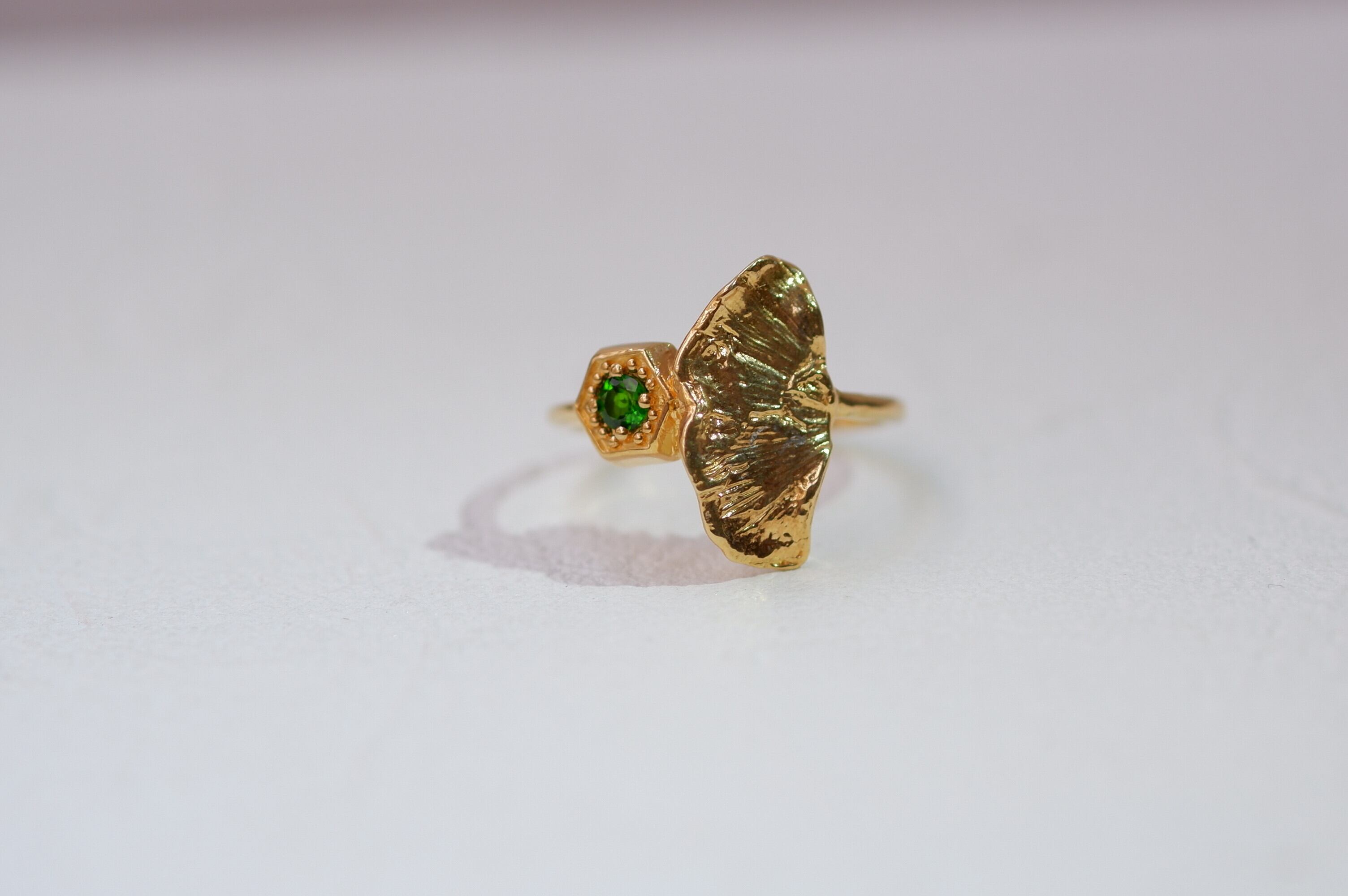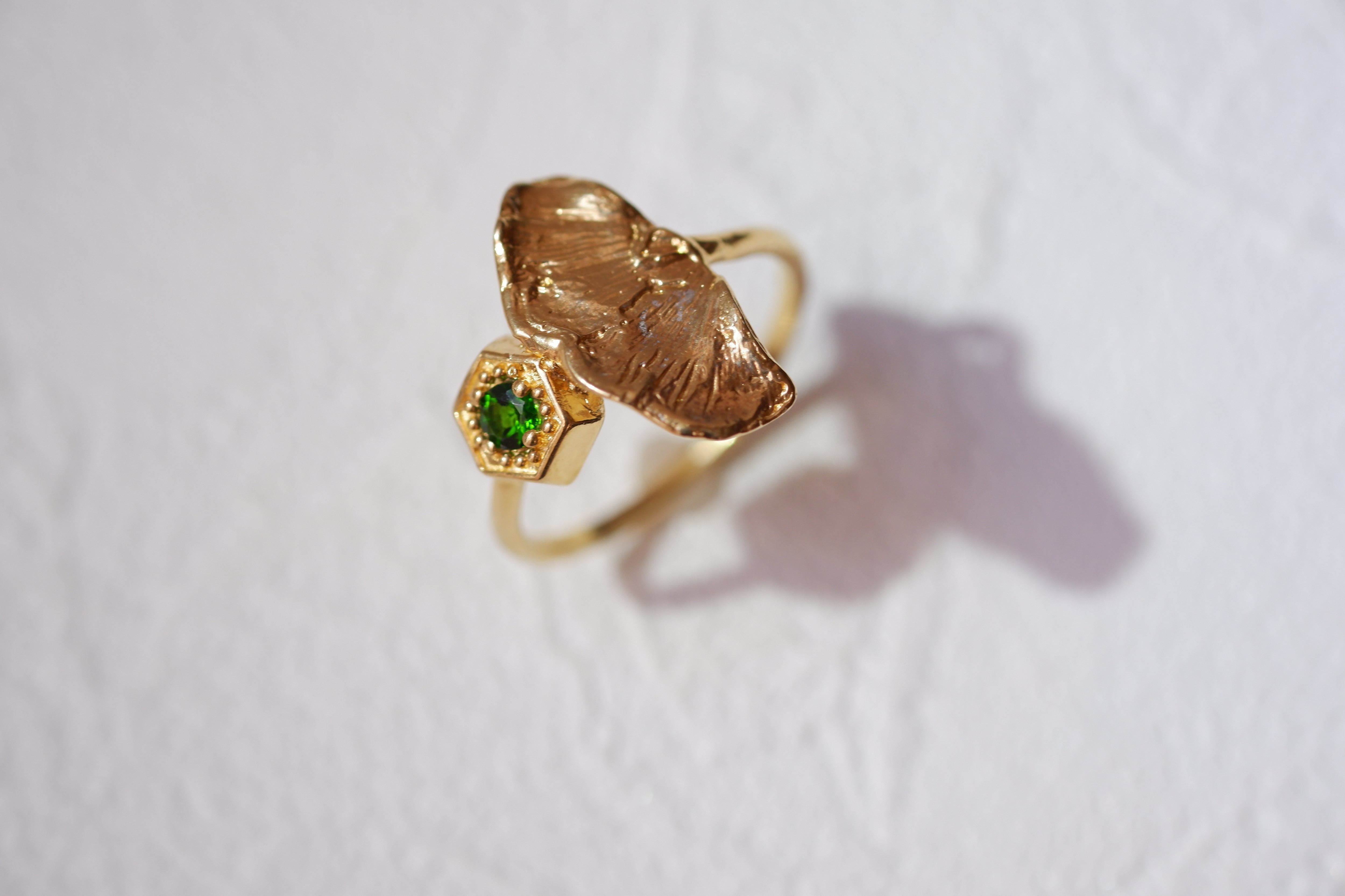 自然の美しさをそのままデザインしたイチョウの葉リング。6角形の繊細なフォルムは、秋の彩りを感じさせるデザインで、存在感とエレガンスを兼ね備えています。イチョウの葉をモチーフにしたその形状は、個性的でありながらも、どんなスタイルにもマッチするアイテムです。