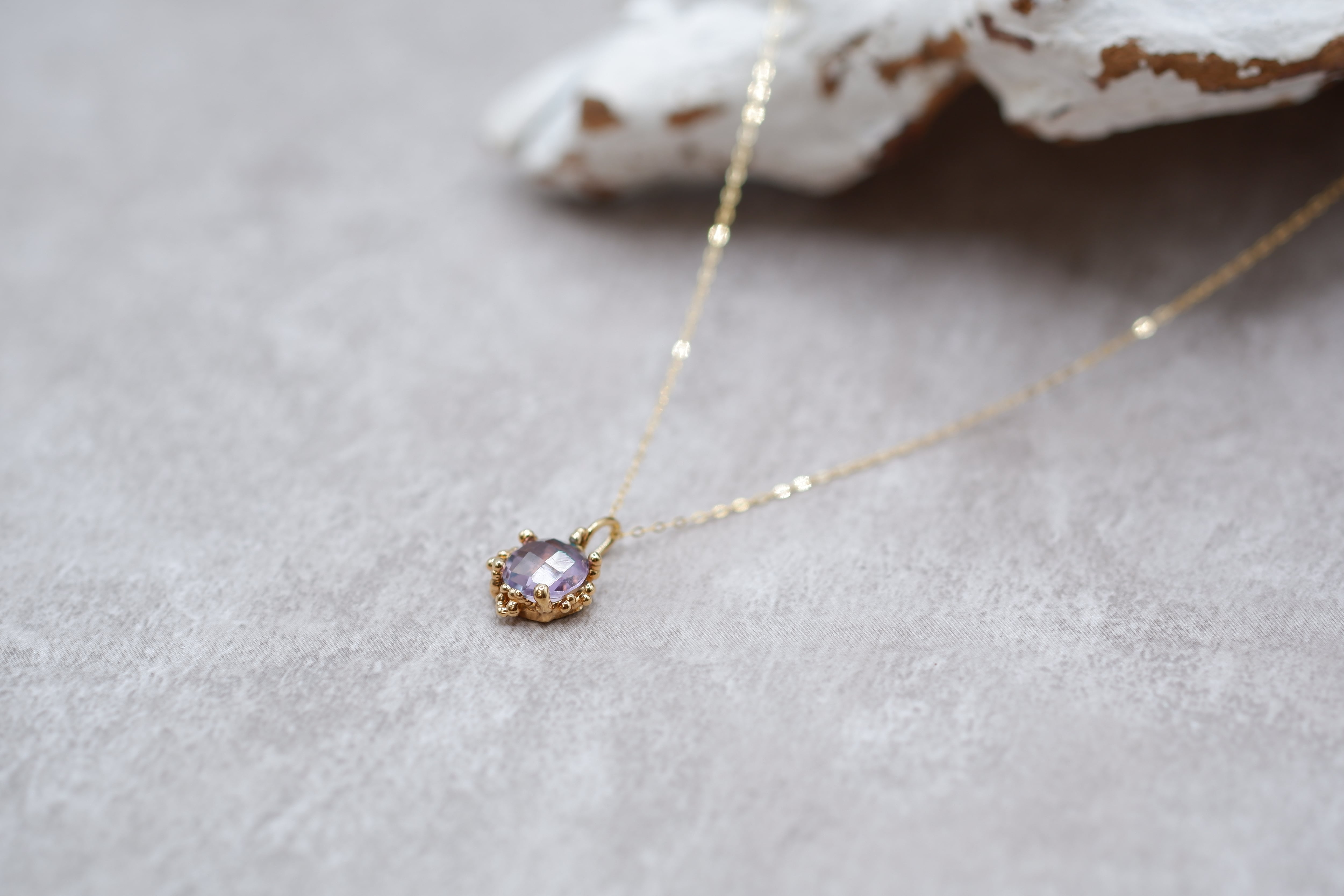 美しいアメジストを使用したSuiteki Necklace(Amethyst)。水滴のような粒々のデザインが、光を受けて幻想的に輝き、首元を華やかに演出します。このネックレスは、さりげなくも存在感を放ち、どんなコーディネートにもマッチする優れたアイテムです。