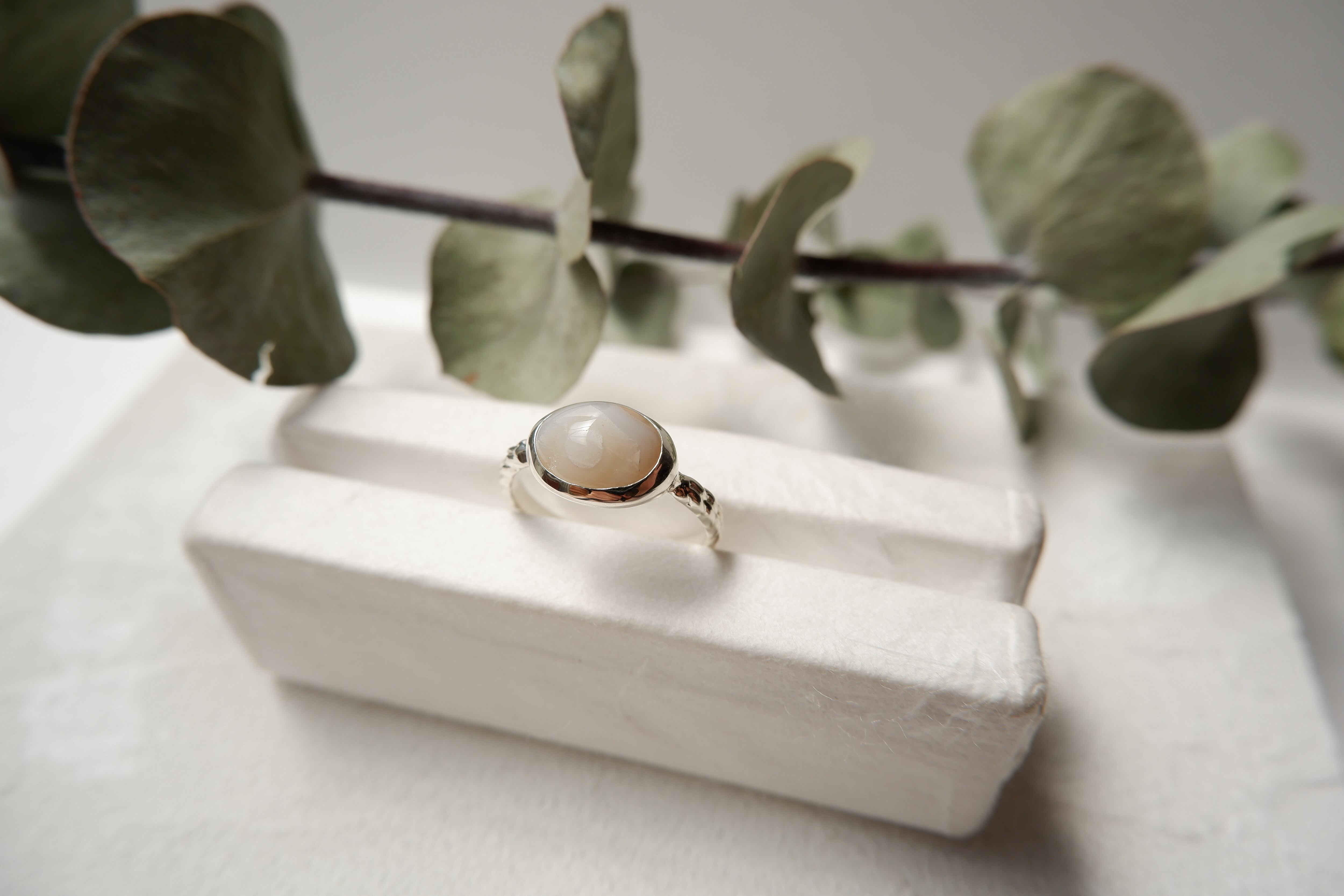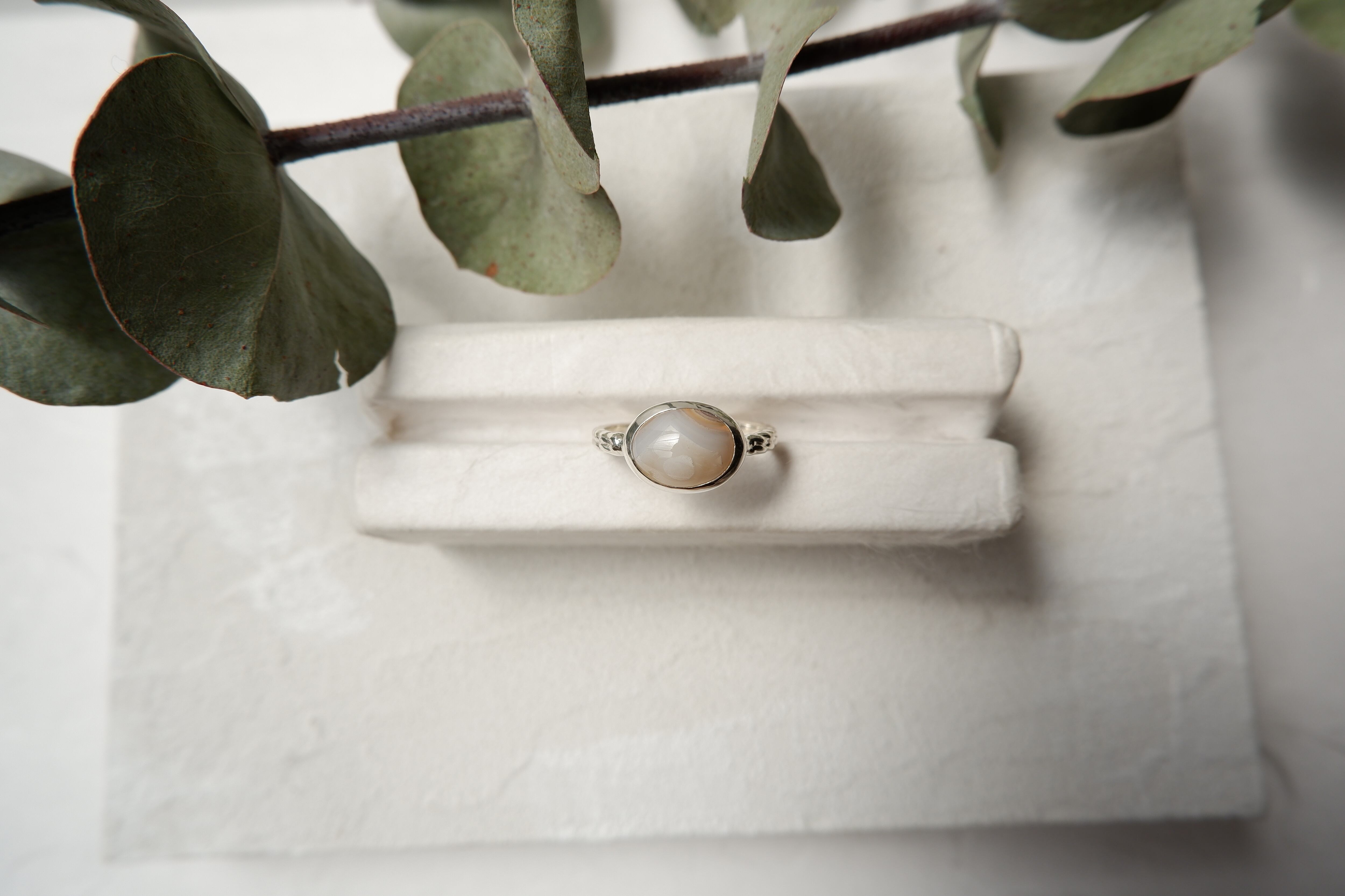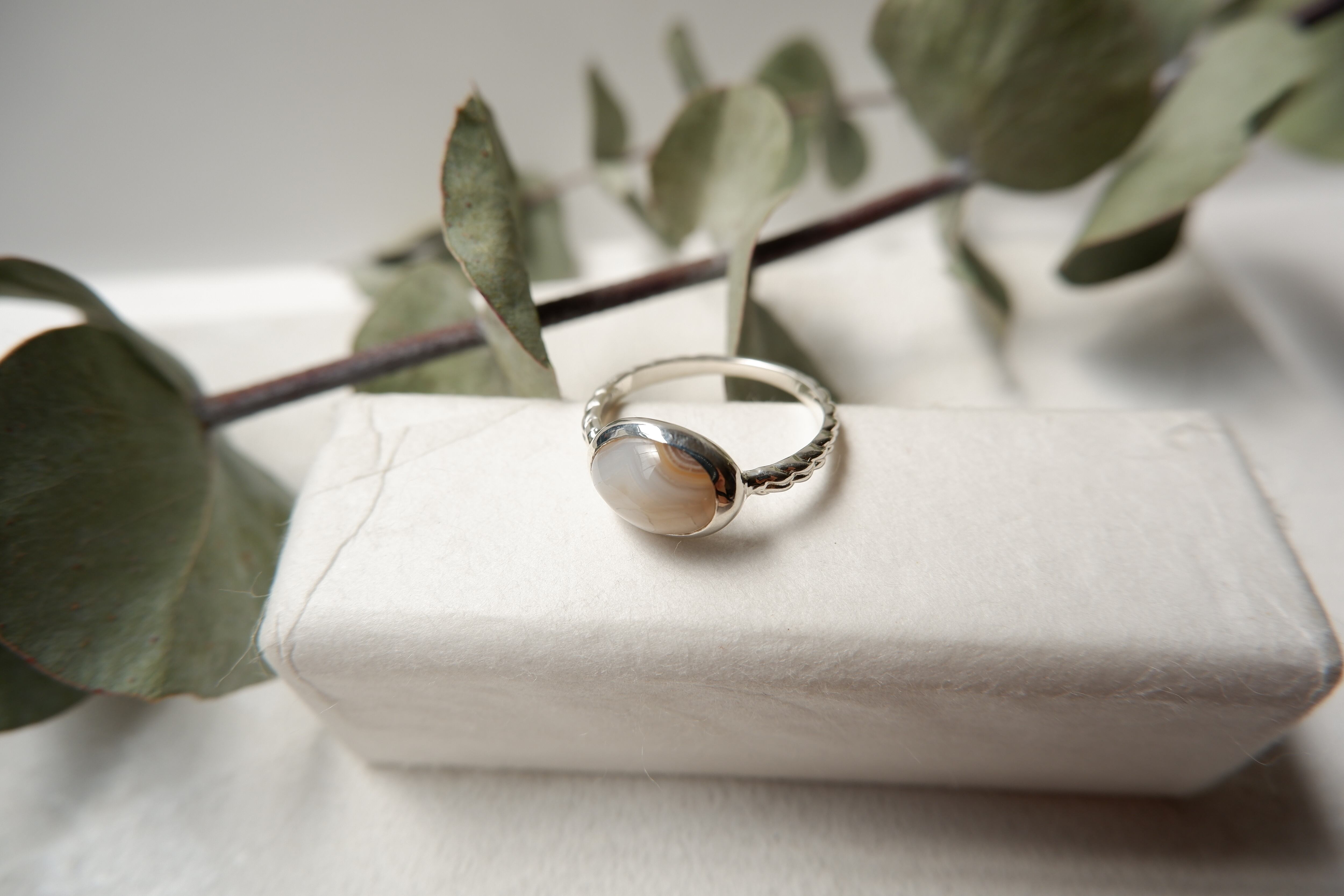 メノウの天然石は同じ柄が無く1点物となります。絵画の様な柄模様が美しい指輪となっております。クレイジーレースアゲートは「精神の安定」をもたらすと言われております。