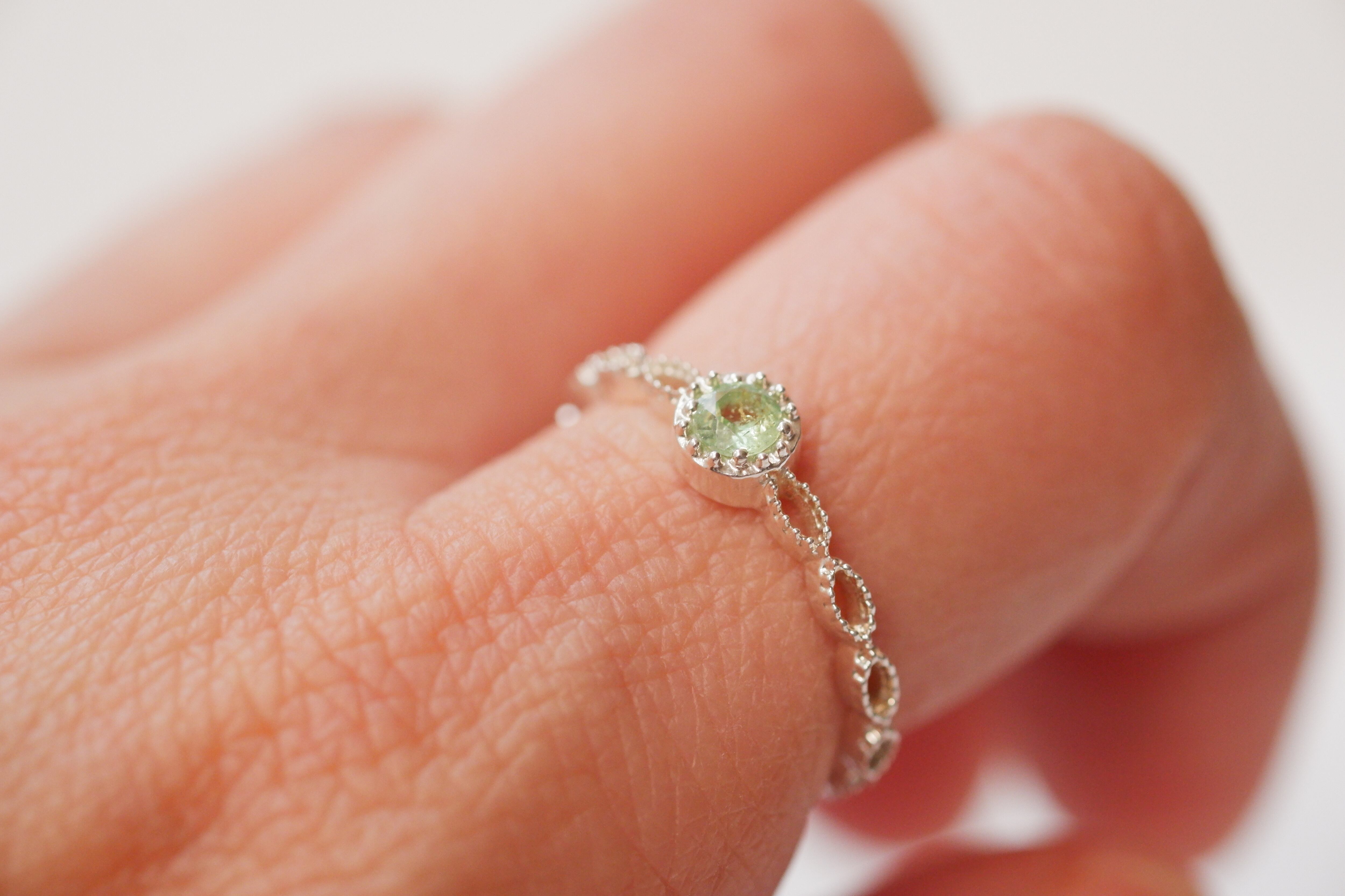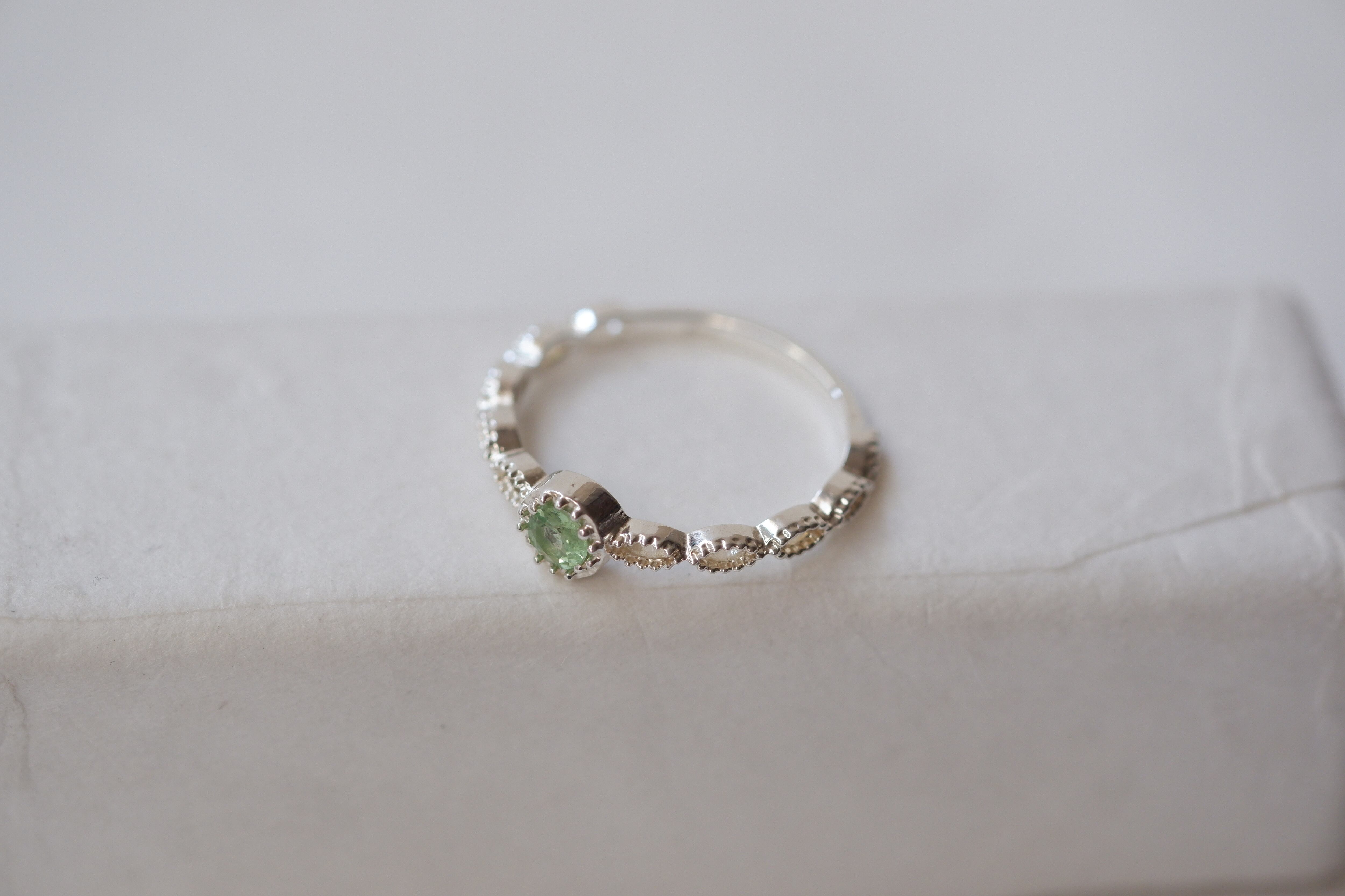 中心に3.5mmの大きな天然石の入ったリング。ミル飾りで留めております。