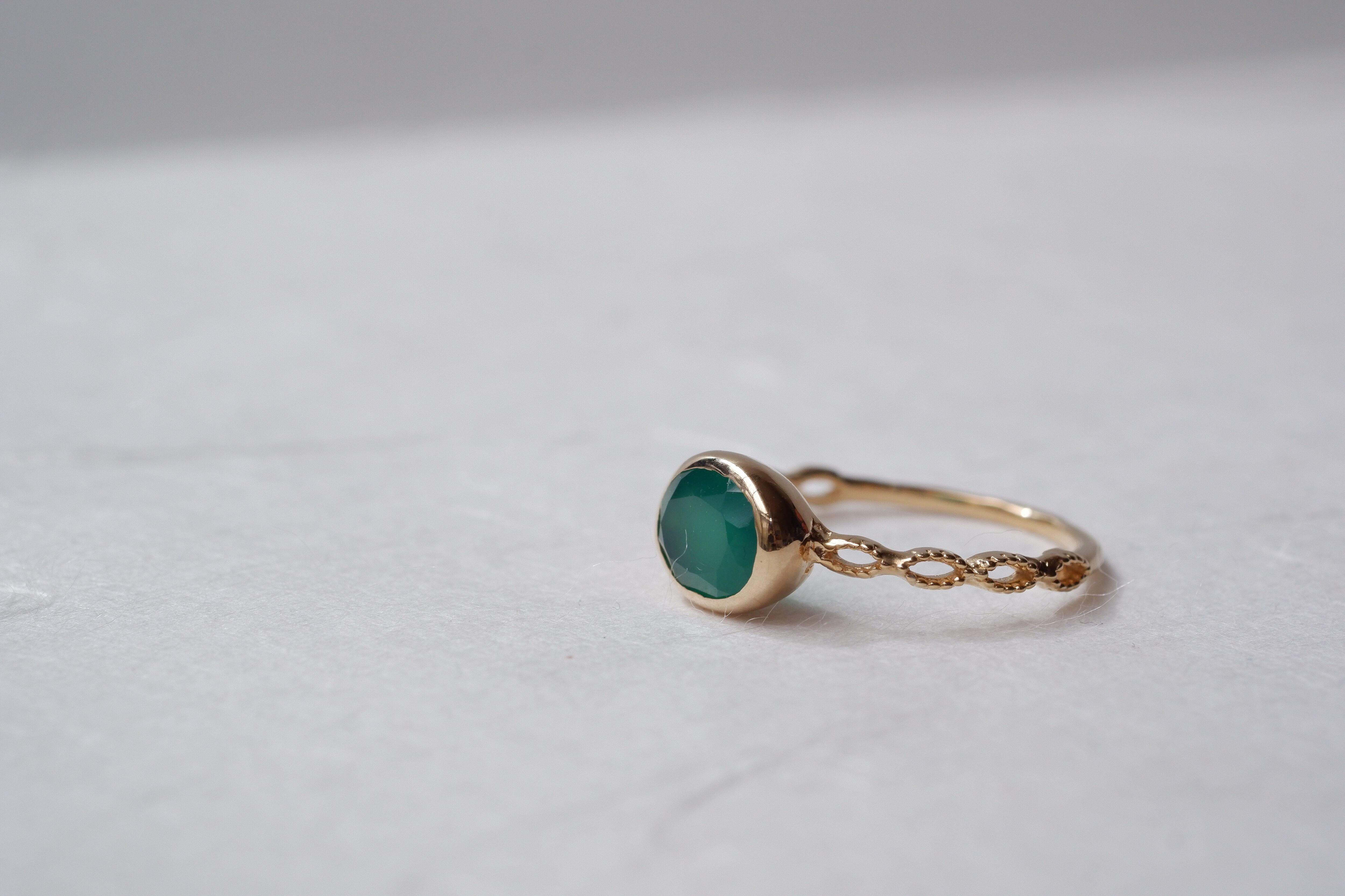 鮮やかなGreenが目を引くデザインとなっております。硬度もある石なので気軽に日常使いしやすい天然石となっております。
