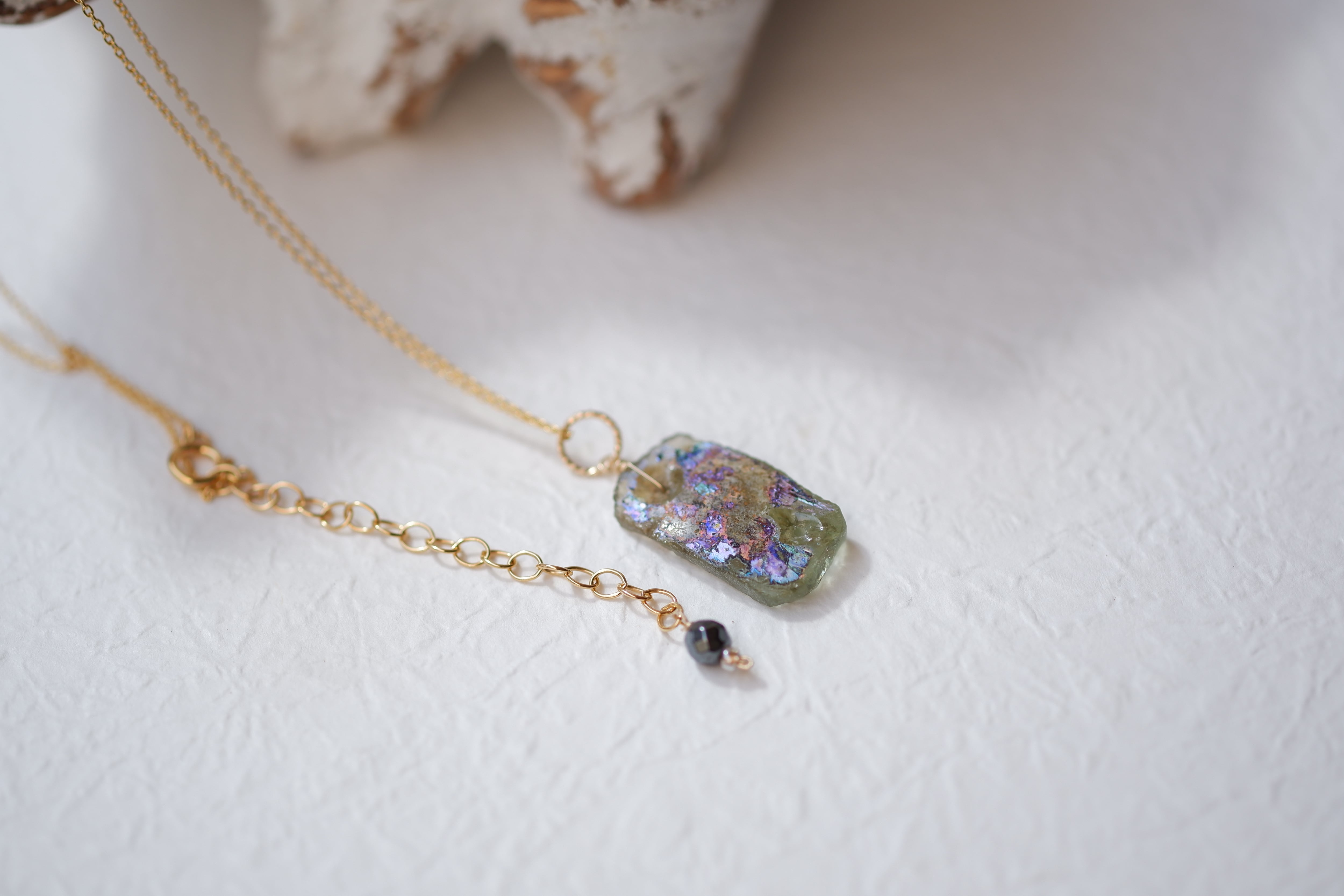 イスラエル、レバノン、アフガニスタンなどで多く産出される紀元前のガラス。遺跡発掘の時に一緒に出土されるバラバラになったガラスを再利用して製作しております。